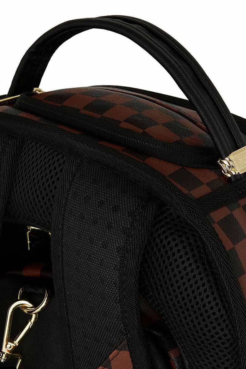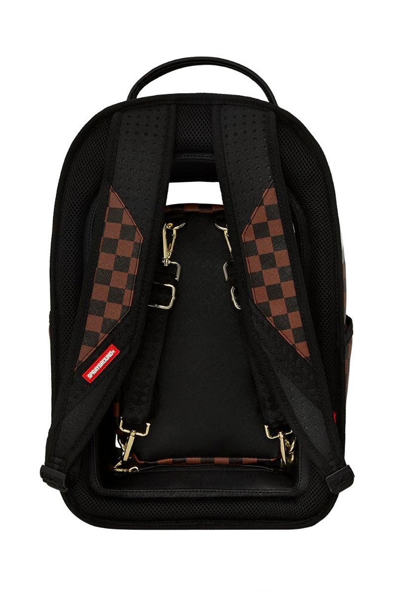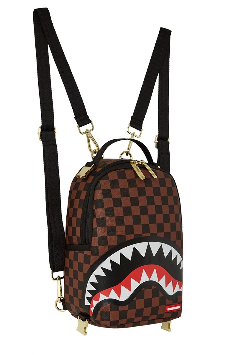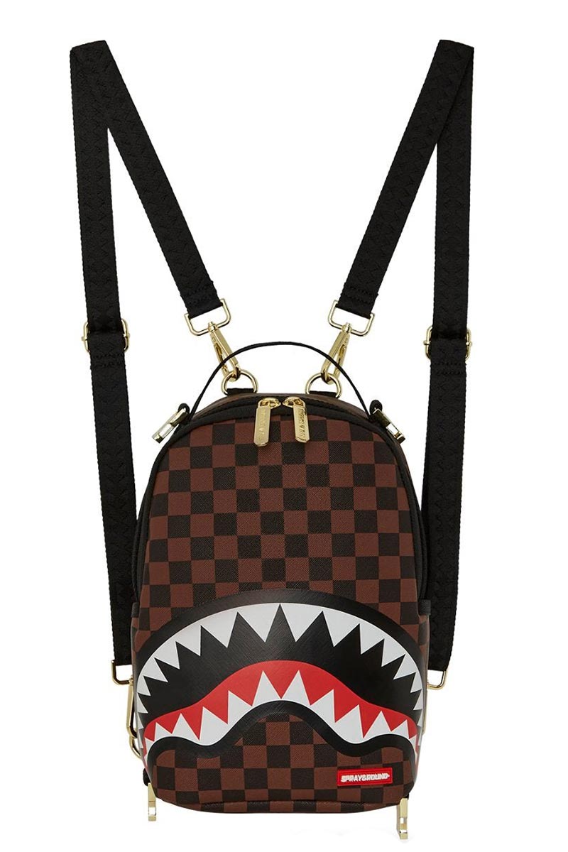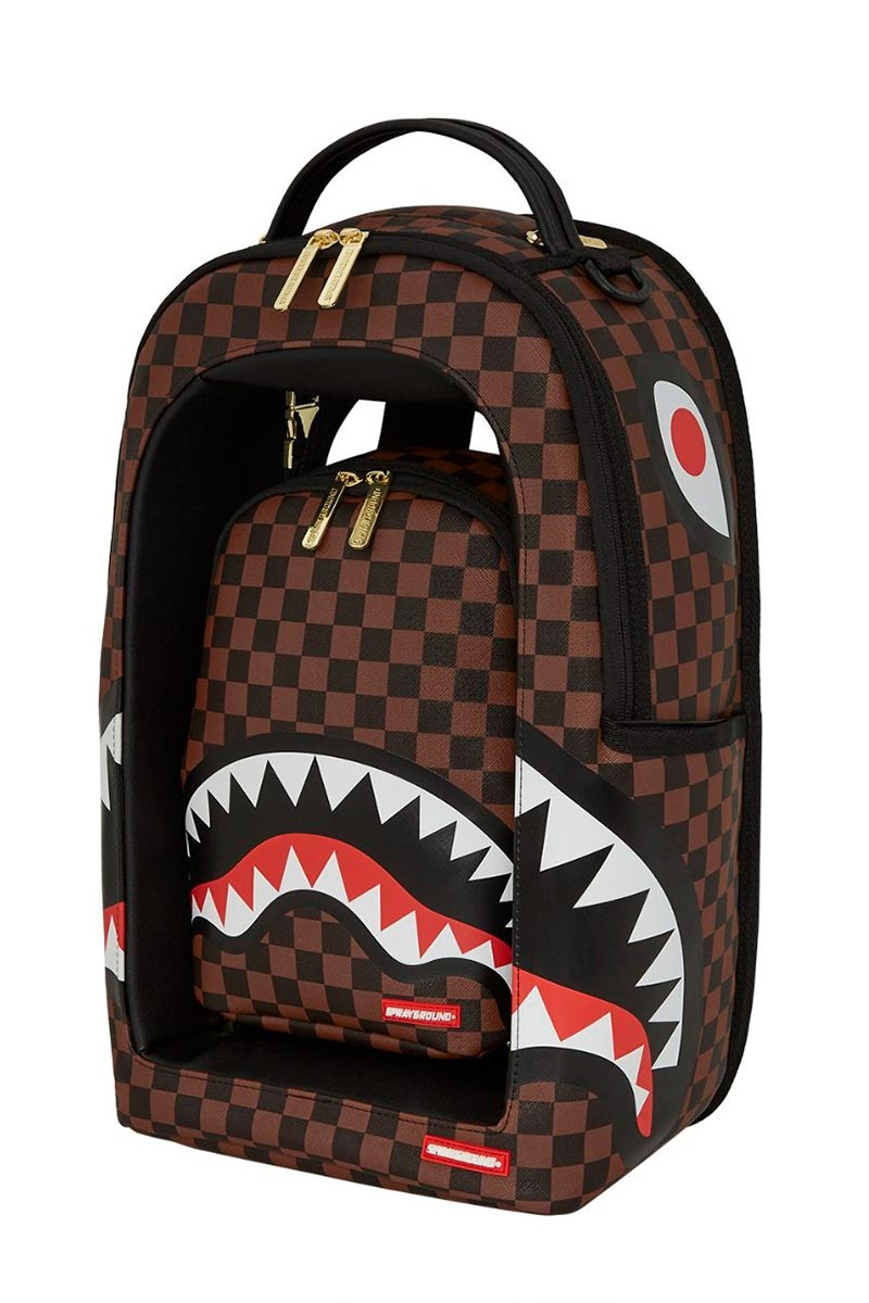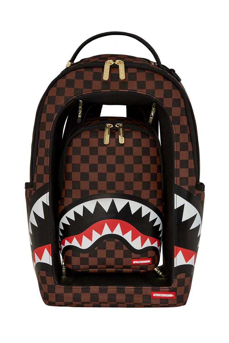 Sprayground backpack featuring a detachable, and functional mini backpack with adjustable straps. Exterior backpack has limited functionality but has functional side pockets, sunglass pocket, and secret bottom panel pocket. Mini backpack has two interior pockets large enough to hold a small tablet and daily necessities.